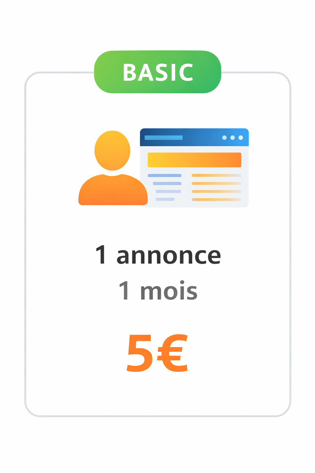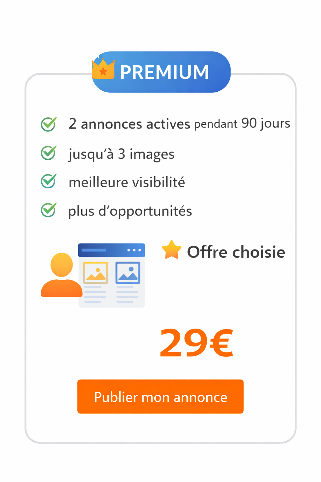 Nos offres 🚀 Nos offres Choisissez l’offre adaptée à vos besoins et publiez votre annonce en quelques minutes Offre Basic 1 annonce • 1 image • 30 jours Publier mon annonce ⭐ Recommandé Pack Visibilité Plus d’annonces • Plus de visibilité Publier mon annonce Offre Premium Visibilité maximale • Longue durée Publier mon annonce